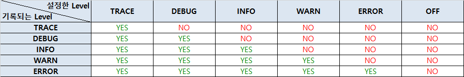 예를 들어 INFO로 지정된 로거의 경우 INFO, WARN, ERROR로그만 기록한다. 아래 표를 참고해도 좋다.