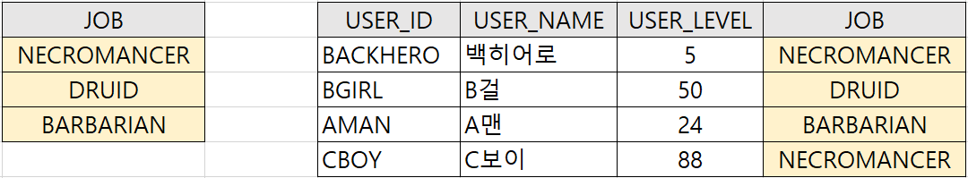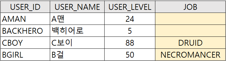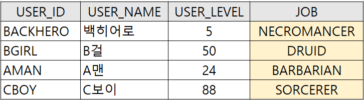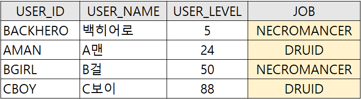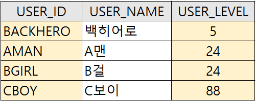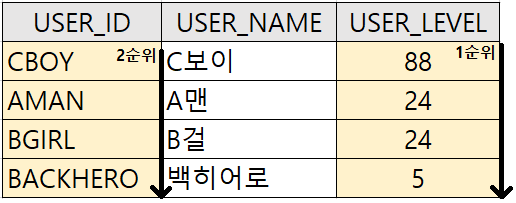 위와 같이 USER_LEVEL을 기준으로 오름차순으로 정렬하고, USER_LEVEL이 같은 로우끼리 USER_ID기준으로 오름차순으로 정렬하려 조회하게 된다.
